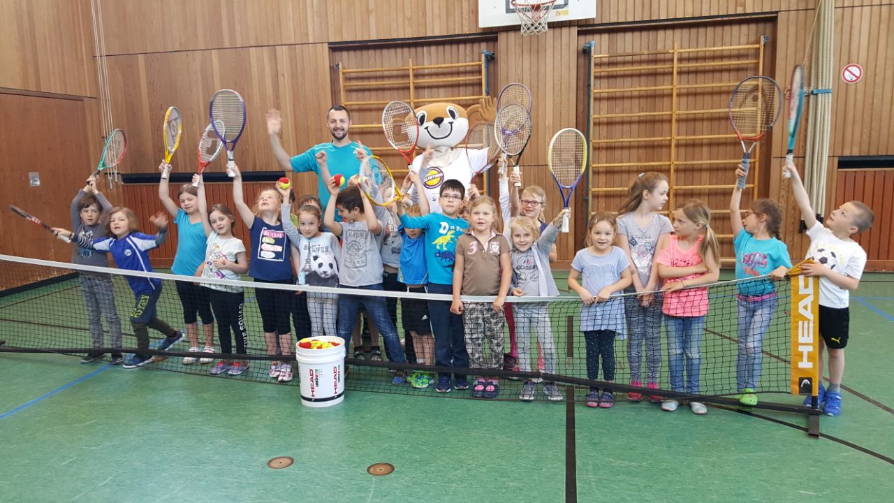 Wie schon im letzten Jahr besuchte Daniel Nagy, unser neuer Trainer, zusammen mit Christian Gruß als Talentino Bär die Grundschulen und zeigte den Kindern erste Übungen zum Tennissport. Den Schülern machen die Ball- und Koordinationsspiele immer viel Spaß und auch die Schulleitungen waren von diesen besonderen Sportstunden begeistert.